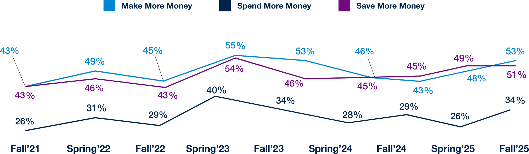 Higher-income households (HHI >$100K) are increasingly confident, reporting strong expectations for earning (61%) along with greater willingness to spend and save. The upward trend across intent to make, spend, and save was last seen in Spring 2023, also driven by high income households in non-discretionary categories despite economic concerns. For higher-income households, history looks to be repeating itself. At the same time, medium-to-lower income households (HHI <$100K) are showing early signals of cautious optimism, with improved outlook on plans to spend, modest improvements in earning expectations and steady saving intentions. Together, these results suggest higher-income confidence may fuel discretionary growth, while gradually improving sentiment among lower-income households points to a slow but notable easing of pressure on broader demand.