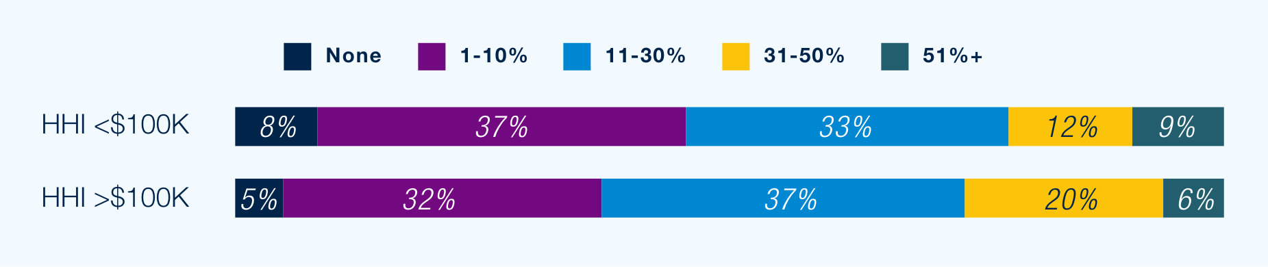 Tariffs have also impacted consumer perceptions of cost. A majority of consumers believe that tariffs have driven prices higher, with 63% of all consumers citing increases in the 11– 50% range. Higher-income households (HHI >$100K) are more likely to report steeper perceived price hikes, underscoring that tariffs are seen as a driver of rising everyday costs.
