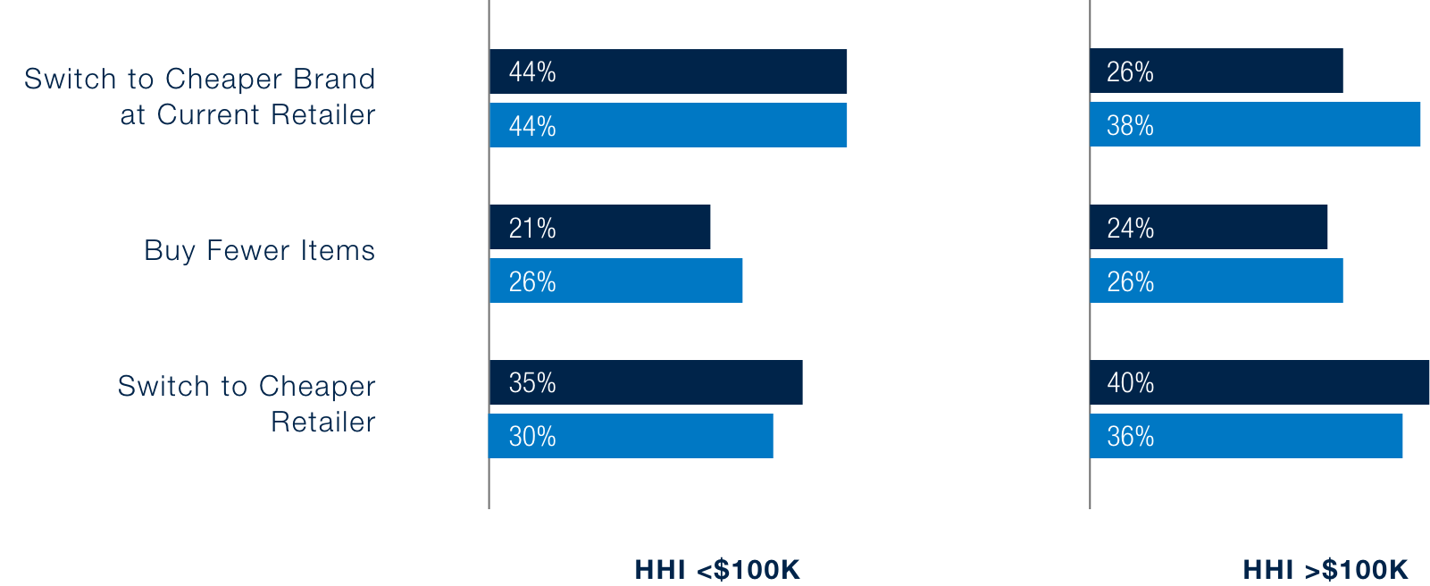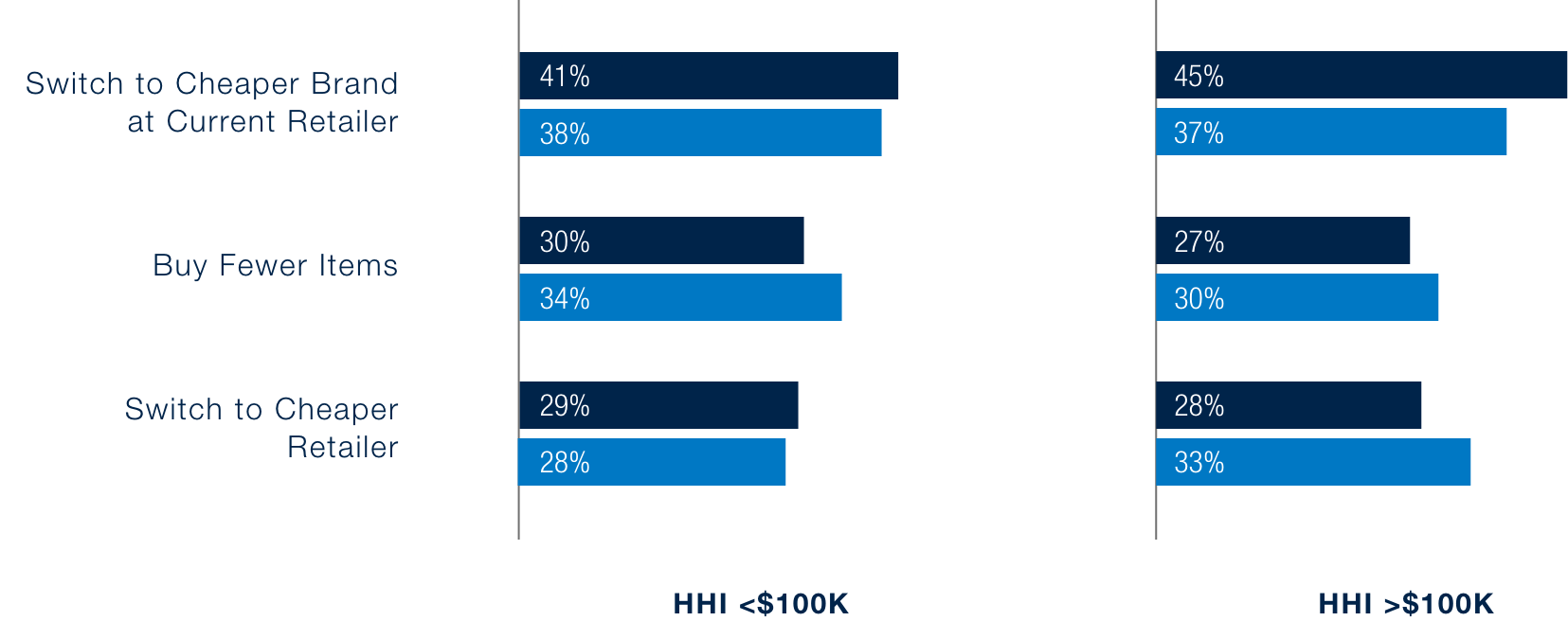 Across income groups, switching retailers as a strategy has softened. In personal care, both higher-income households (HHI >$100K) and lower-income households are more likely to trade down to cheaper brands at their current store (38% and 44%, respectively) than switching retailers in search of better prices (36% and 30%, respectively).