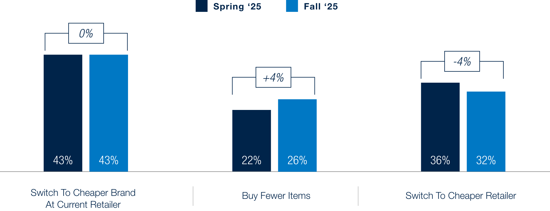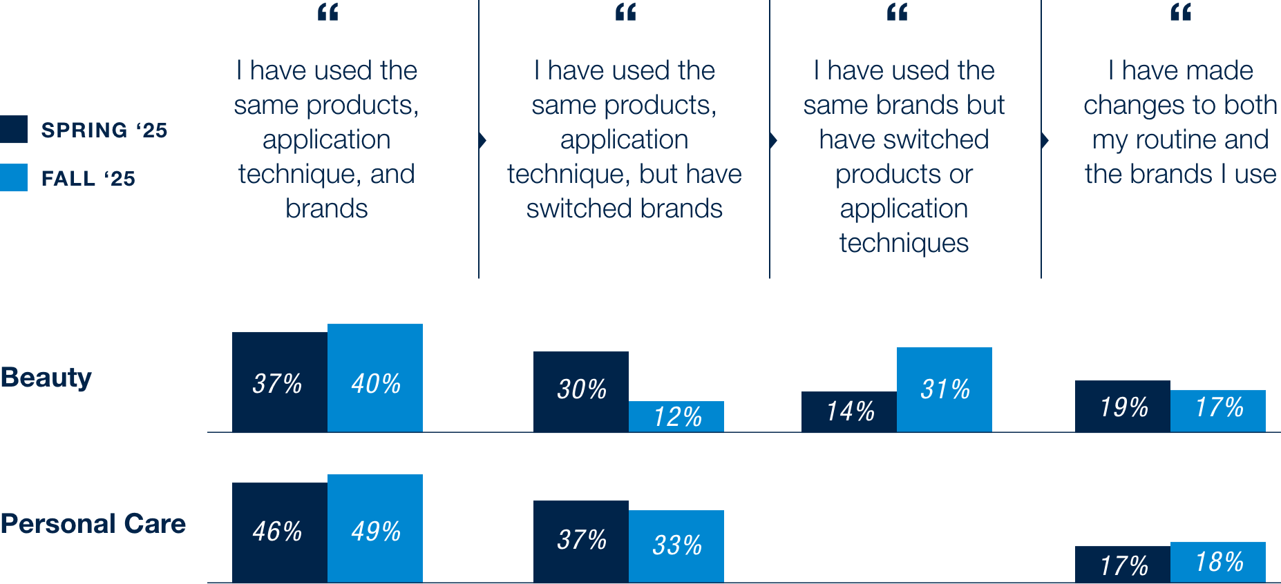 When it comes to personal care, brand loyalty remains low compared to retailer loyalty. Among cost-conscious consumers, 43% of consumers say they’ll switch to cheaper brands at their current retailer while 32% are willing to switch retailers entirely in search of lower prices. However, behaviors are shifting. More shoppers are choosing to buy fewer items (+4 pts from Spring to Fall ‘25), while willingness to switch to cheaper retailers has softened (–4 pts). This suggests that cost savings are being found more through moderation and brand-switching than through shifting retailers.