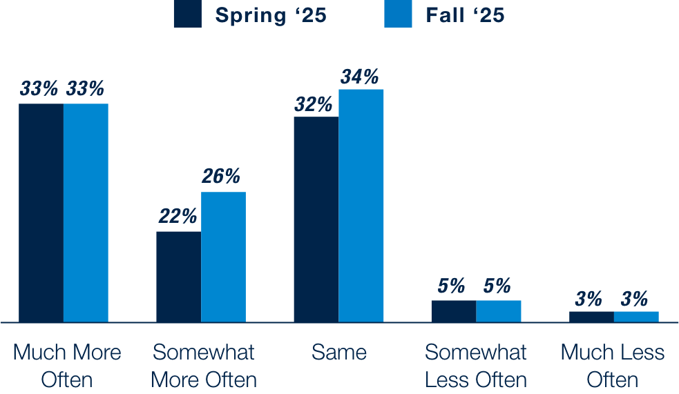 This fall, consumer spending plans by category reflects improved optimism across both essential and discretionary categories, a modest uptick from Spring ’25 levels. Moreover, we see an uptick YoY from Fall ’24 to Fall ’25, primarily in discretionary categories such as beauty, electronics, and jewelry. However, it comes at the expense of basic needs and essentials such as grocery and personal care, which have experienced a decline YoY, suggesting consumers may be shifting their budgets from basic needs to fund discretionary purchases.