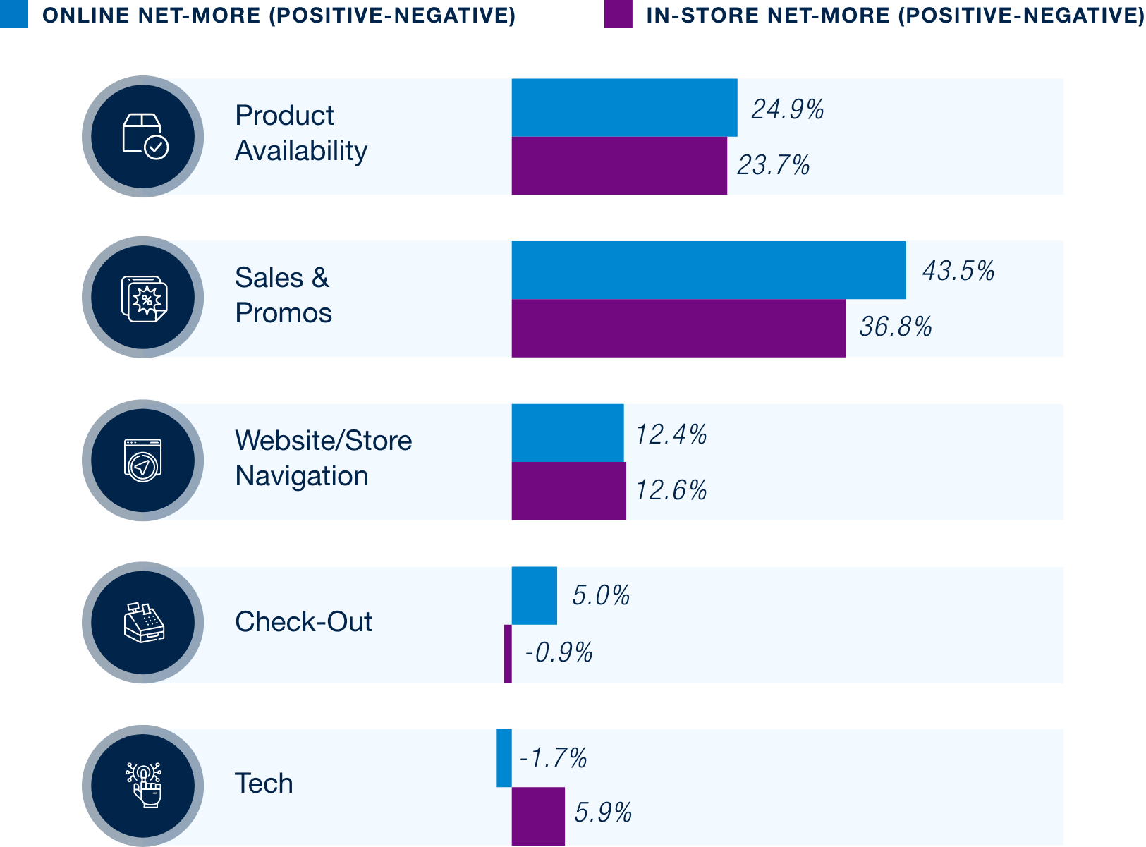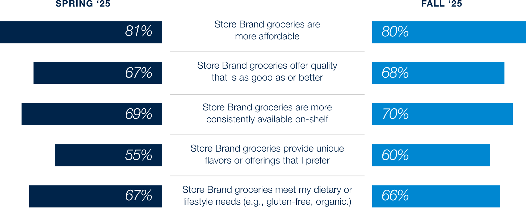 In addition to shifting towards lower-cost store alternatives, consumers continue to express positive feedback towards store-branded grocery items. Compared to last cycle, perceptions on quality and availability have increased slightly (net-more = 1%) while unique flavors and offerings have increased moderately (net-more = 5%), continuing to show that value is driven beyond price, but also by quality and taste of the products.