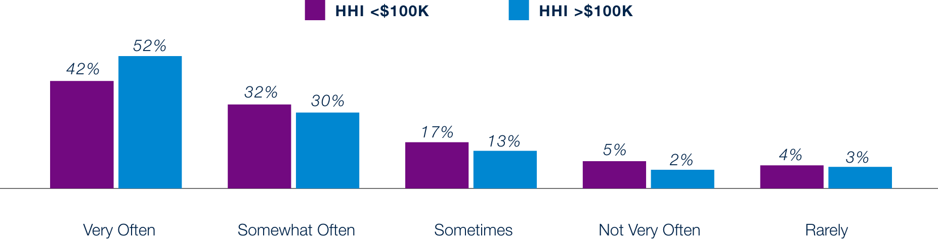 channels. We see that consumers have increased their trips to lower priced grocers, with 59% having reported making increased trips the last 6 months, an increase from 55% in the previous cycle. Moreover, 61% households with $100k+ income reported increased frequency at lower-priced grocers compared to 58% of households with <$100k+ income. Consumers across the spectrum are reflecting a concern over increasing prices at traditional grocery outlets and are adjusting their spending habits to manage household budgets.