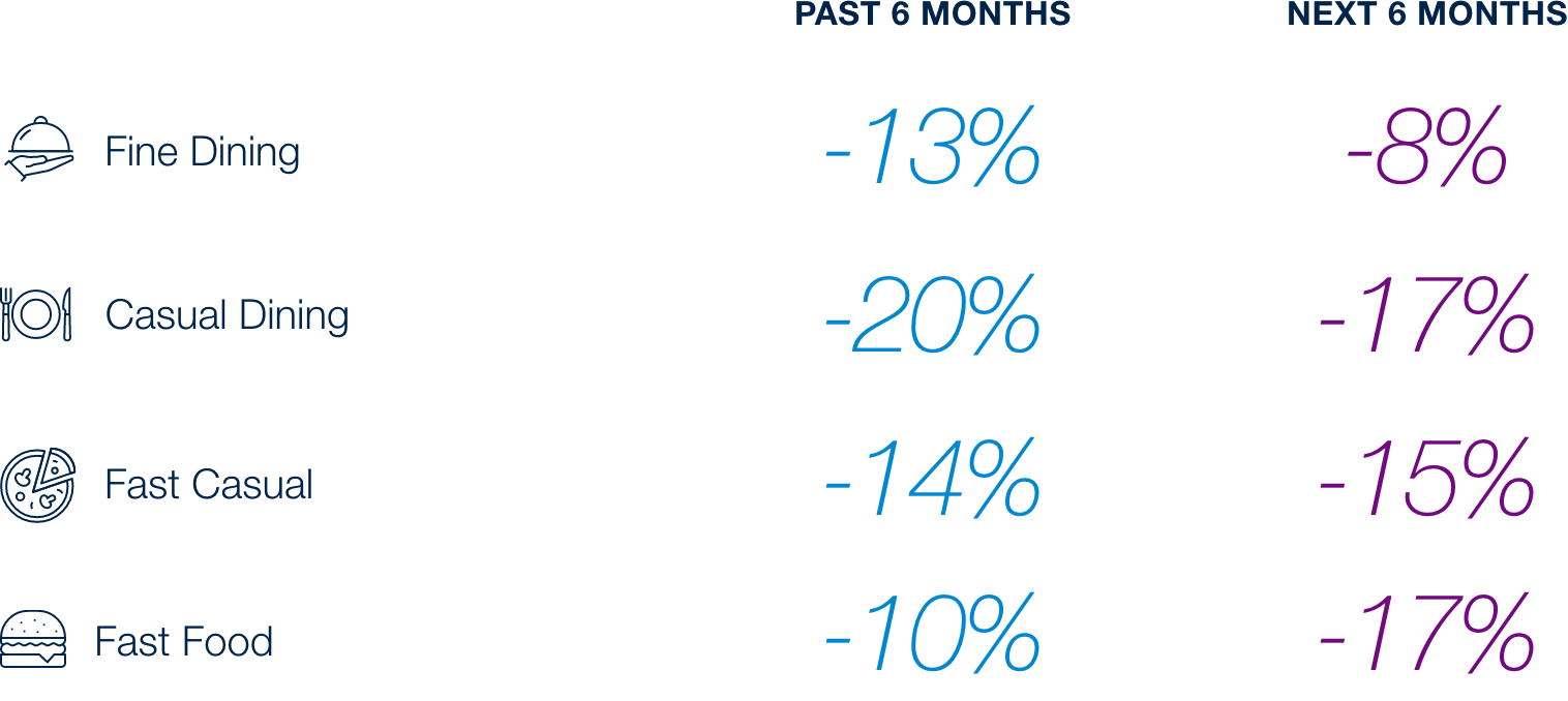 When it comes to restaurants, 52% of consumers have cited reduced consumption in the past 6 months while 43% state that they anticipate reducing spend in the next 6 months. Moreover, the spending at restaurants is affecting all formats, with Fast Food and Fast Casual feeling the pinch most acutely despite being the lowest cost offerings. This trend reflects that consumers are not only prioritizing price with their dining options, but also other aspects such as the dining experience.