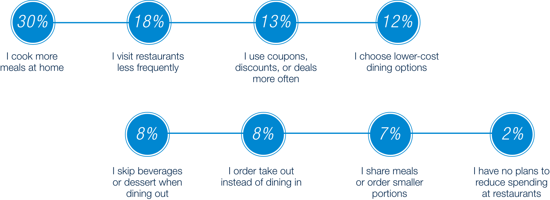 While consumers are reducing their spending at restaurants, there appears to be correlation to grocery activity in the market. 30% of consumers cite preparing meals at home as a viable replacement, which directly influences their behavior when it comes to grocery shopping. Additionally, consumers continue to use tested methods such as less frequent visits and available deals to cut back on their restaurant spending.