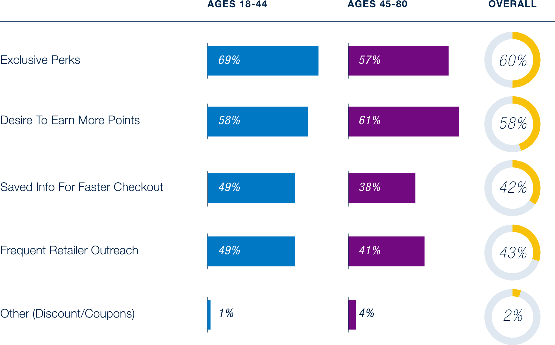Exclusive perks (60%) and earning more points (58%) remain the top loyalty drivers overall. Older consumers (45–80) are more likely to value points (61%) and perks (57%), while younger consumers (18–44) lean more heavily on perks (69%) and are also more influenced by technology-driven convenience. Nearly half of younger shoppers (49%) say saved information for faster checkout encourages them to spend more, compared to 38% of older consumers. This generational split underscores that while perks and points are universal motivators, younger shoppers are far more responsive to tech-enabled features that simplify the shopping journey.