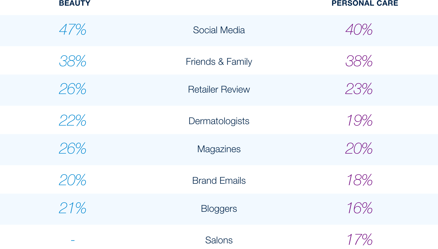 Social media continues to be the leading driver of product discovery and purchase in both beauty and personal care. Nearly half of respondents discover products through social platforms (47% for beauty, 42% for personal care), outpacing word-of-mouth from friends and family (38% for beauty, 40% for personal care). Both younger and older consumers have increased their use and reliance on social media to discover products (up to 56% and 37% among younger and older consumers, compared to 53% and 35% from the spring). These insights highlight the critical importance of robust, targeted digital engagement strategies across social channels.