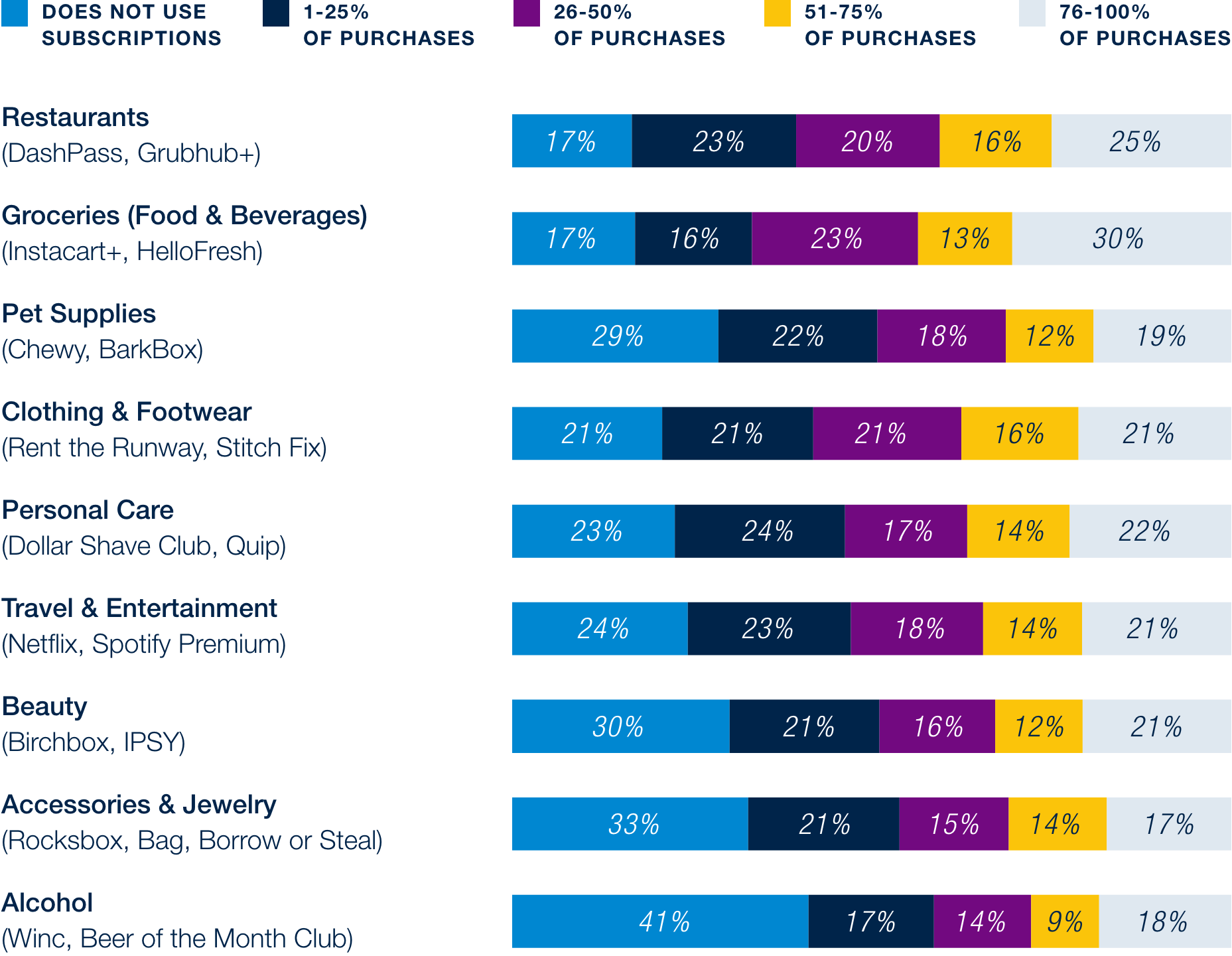 Subscription service models continue to play a meaningful role in how consumers shop and engage with retailers, with adoption spanning across categories and increasing from Spring ‘25. Restaurants and food & beverage subscriptions show the highest penetration, with nearly half of respondents using them for at least 50% of their purchases. Subscription usage is consistent in other categories as well, with steady adoption across pet supplies, clothing, personal care, travel and entertainment, and beauty.