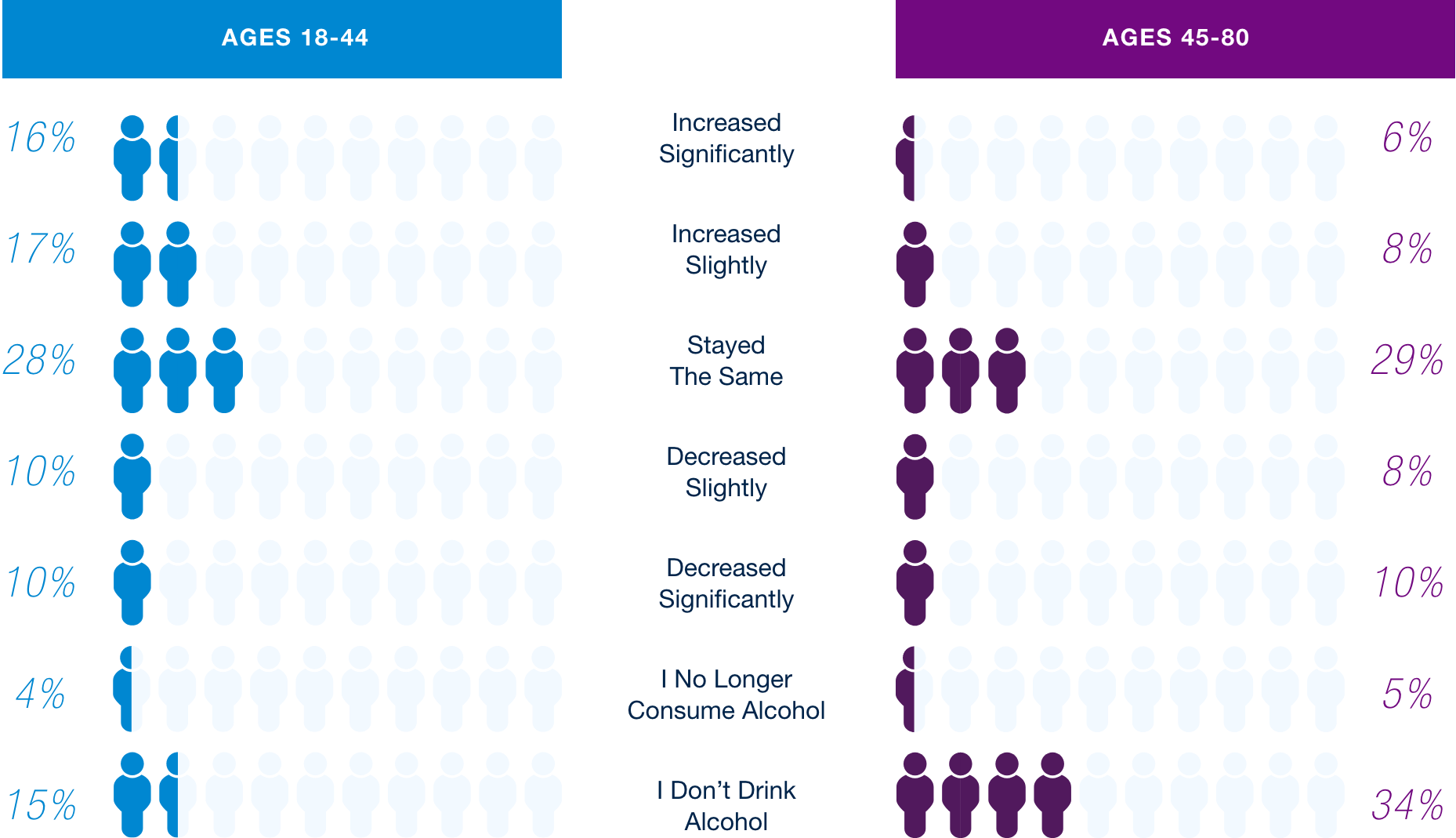 Nearly half of consumers (48%) report that they are either abstaining from alcohol entirely or planning to reduce their consumption over the next six months. This moderation trend looks different across age groups. Younger consumers (18–44) are the ones most likely to increase their alcohol intake, while older consumers (45–80) are driving the shift toward abstinence, with over one-third reporting they don’t drink at all. The data suggests that growth in alcohol consumption is concentrated among younger demographics, while older consumers are stepping away from drinking altogether.
