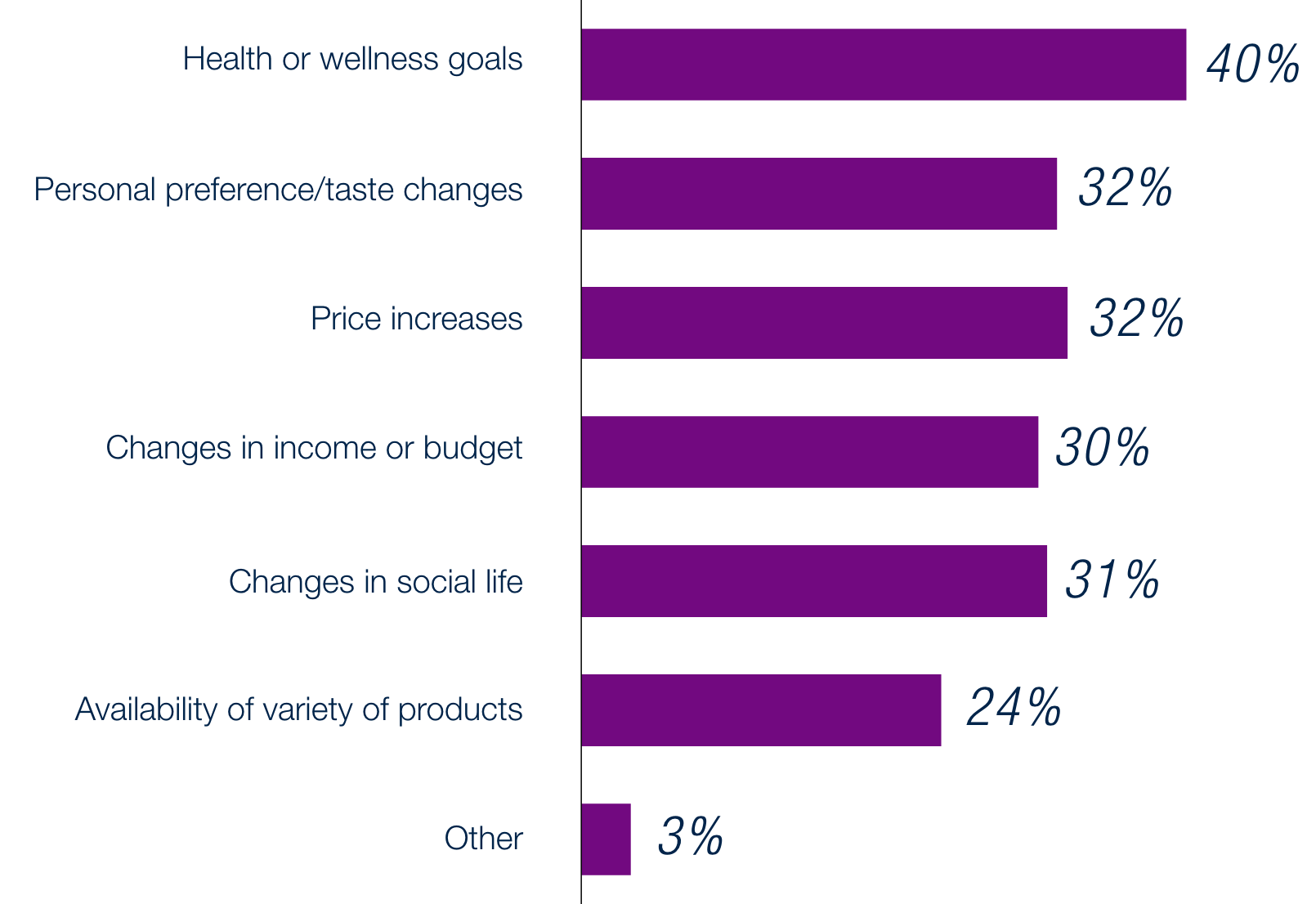 Unlike many other categories where price is the leading driver of behavior change, alcohol consumption stands out. Here, consumers are primarily motivated by health and wellness goals (40%), with cost considerations like price increases (32%) and budget constraints (30%) taking a back seat. This highlights how deeply personal and lifestyle-driven decisions around alcohol are, with wellness emerging as the top factor shaping consumption habits.