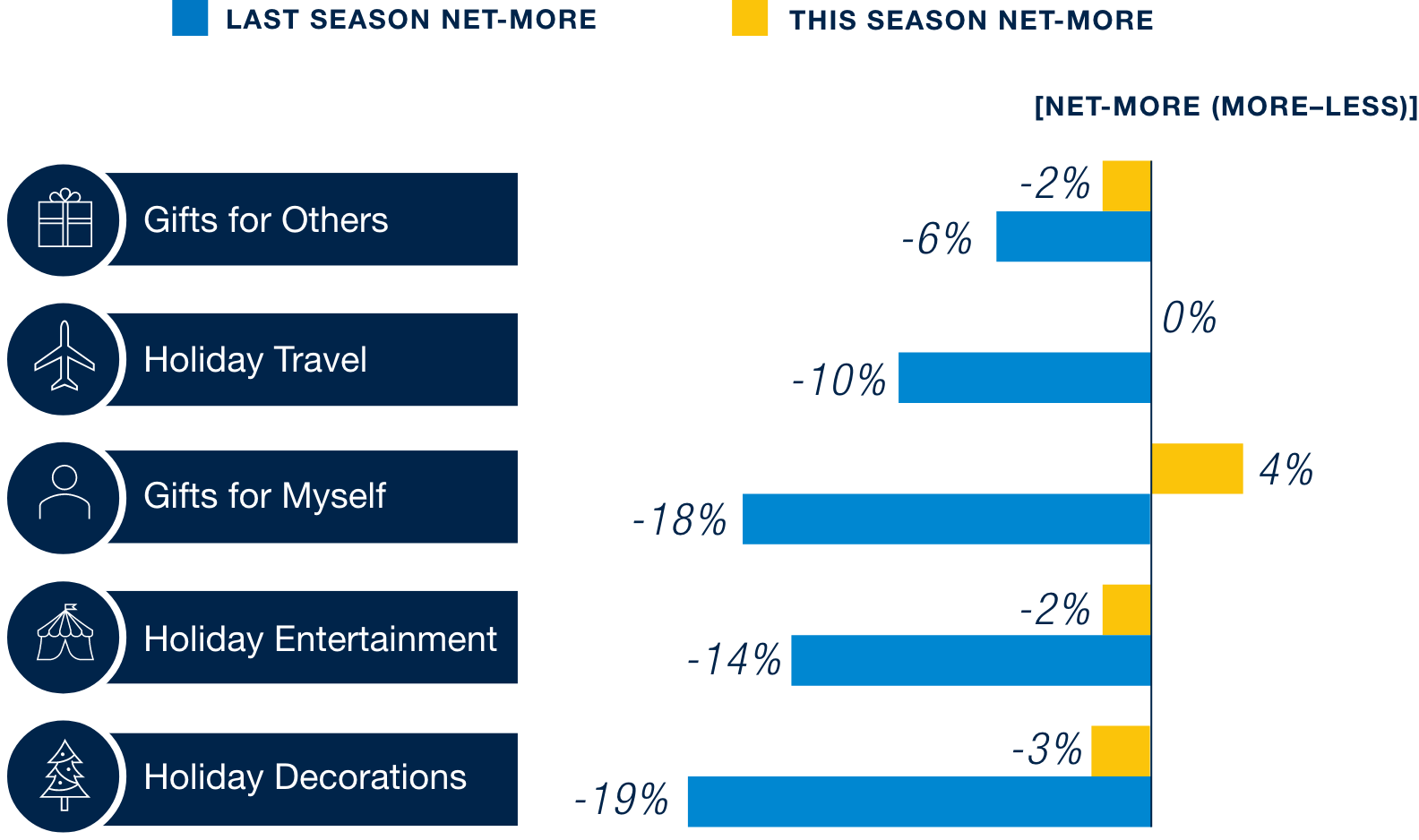 As we approach the holiday season, cautious spending continues to shape consumer behavior. Households plan to spend the same net amount this compared to last year—reflecting the sustained impact of tariffs on holiday-centric products. Holiday decorations continues to experience the largest cut-back (-3% net more) from last season. On the other hand, consumers are more willing to spend on gifts for themselves this holiday season (4% net more) compared to last cycle (-18% net more).