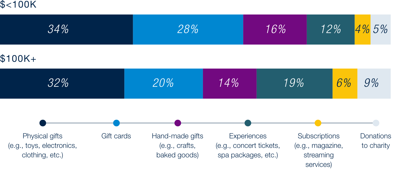 Despite tighter budgets and declining personal spending, holiday gifting remains a priority, with over half of consumers planning to give traditional gifts like physical items or gift cards. Similar to last season, gift preferences are also similar across income levels, but lower-income households favor gift cards—a practical choice that supports basic needs spending while preserving the spirit of giving. On the other hand, higher-income households favored ‘non-traditional’ gifts such as experiences and donations to charity. These patterns highlight how households adapt their gifting strategies to balance meaning and utility during the holiday season.