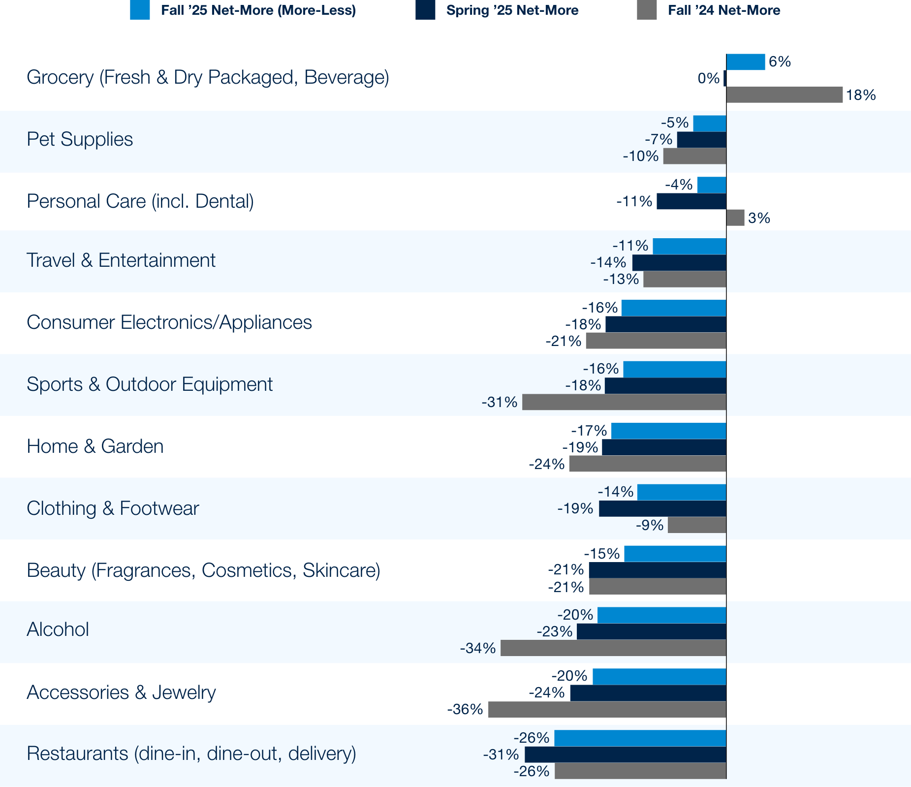 This fall, consumer spending plans by category reflects improved optimism across both essential and discretionary categories, a modest uptick from Spring ’25 levels. Moreover, we see an uptick YoY from Fall ’24 to Fall ’25, primarily in discretionary categories such as beauty, electronics, and jewelry. However, it comes at the expense of basic needs and essentials such as grocery and personal care, which have experienced a decline YoY, suggesting consumers may be shifting their budgets from basic needs to fund discretionary purchases.
